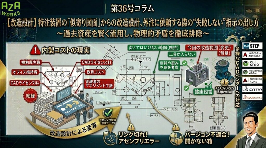 - 課題: 良かれと思って外注先が形状を整えた結果、既存の周辺部品と干渉したり、メンテナンス動線が死んでしまったりすることがあります。